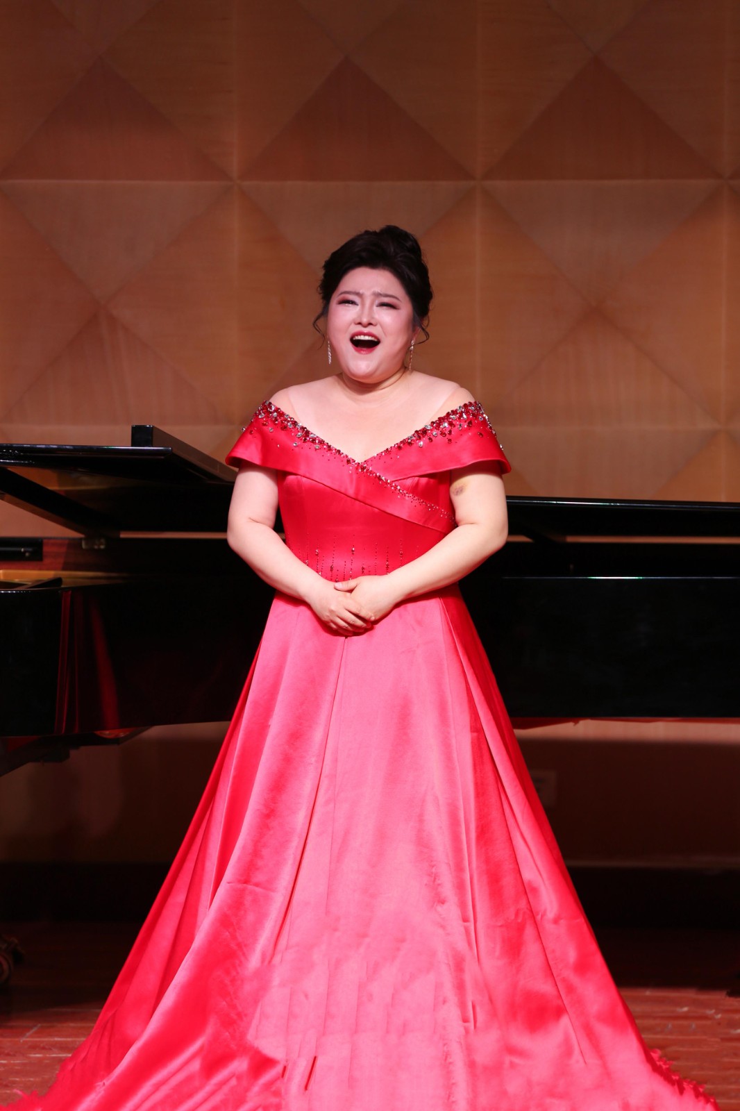 接下来郭飞为大家演唱三首歌曲《欣喜的等待》《渴望你回到我身边》《共和国之恋》。第一首《欣喜的等待》选自是歌剧《伤逝》,这部歌剧《伤逝》由鲁迅同名小说改编而来,是我国歌剧史上的第一部抒情歌剧。此唱段讲述的是女主人公 子君做好饭菜后欣喜地等待爱人涓生回来,看到晚霞、狗儿、油鸡时所唱出的一首短歌。可以感受到子君活泼可爱的真性情,领会到她对自由爱情的向往、和涓生共同生活的愉快。整首乐曲运用小快板的速度和轻快的跳音,节奏流畅、轻松、活泼,充满了爱的活力与生机,满怀期待与憧憬。
