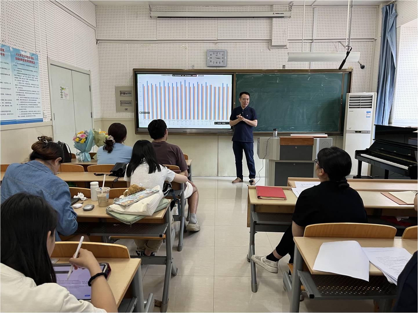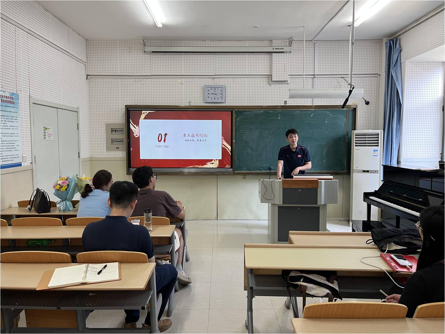顺利考取唐山市曹妃甸区教师事业编的戚智超同学围绕唐山市教师编选聘面试经验进行分享,对招聘信息的获取、报名条件、考试流程以及选岗等问题作出详细解读,并结合自身所抽到的试讲试题进行考场备课示范讲解。他在讲解中指出,熟练掌握音乐教师的“三能八会”,练就过硬的专业本领,是我们能从“考编大军”中脱颖而出成功走上教师岗位所必备的条件。作为音乐学专业的同学,要从平时点滴入手,尽早通过教师资格证考试,并强化对自己的讲课和说课的打磨,